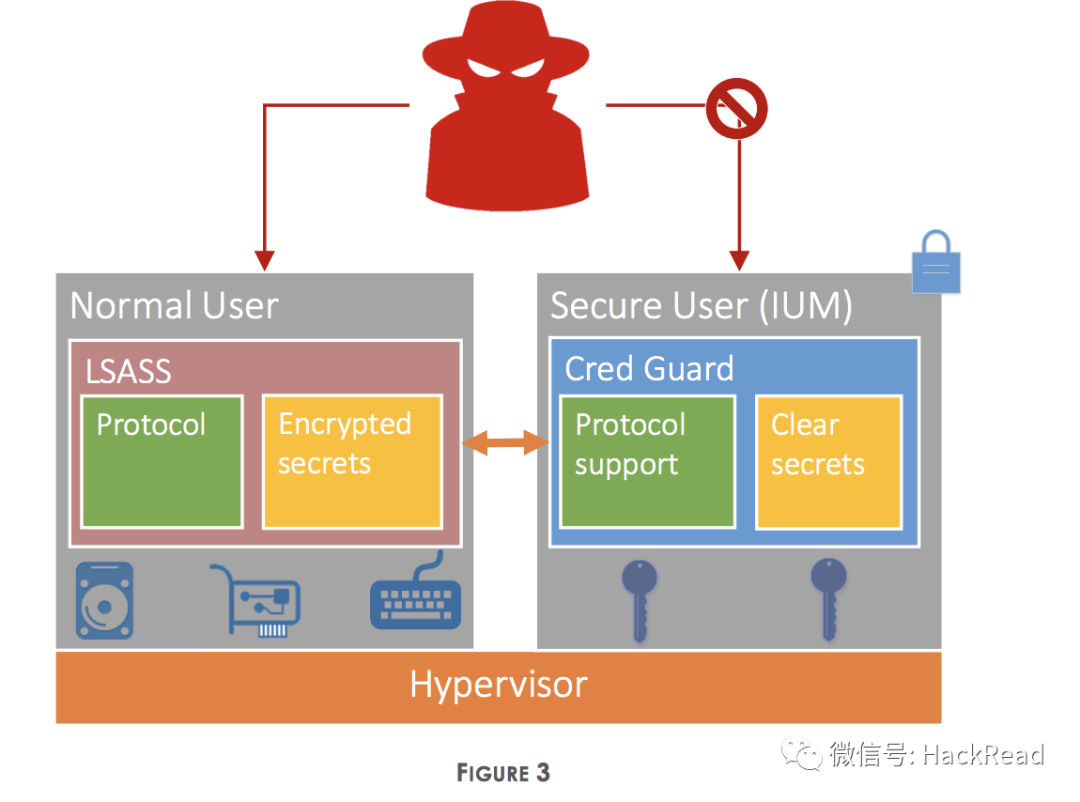 Credentials Guard是win10中引入的新功能,据称能保护NTLM密码哈希值,Kerberos票证授予票证和应用程序存储的凭据。该进程是唯一能使用明文凭据的进程,它的原理大概是这样: