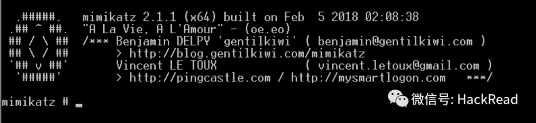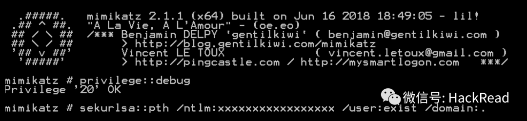 以mimikatz为例,在攻击机上以管理员身份运行mimikatz: