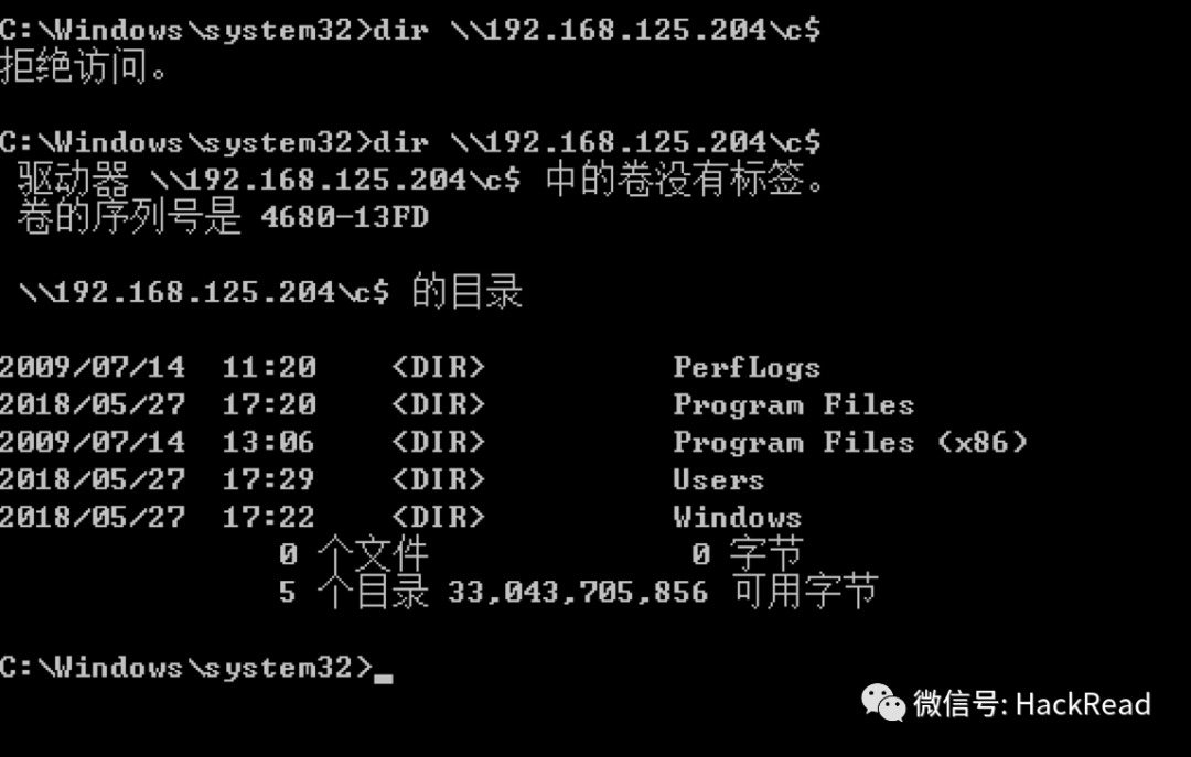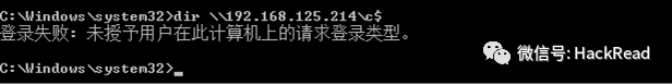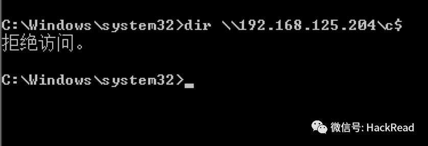 上一步里面我们已经用mimikatz修改了内存中的hash值,那么我们就能利用弹出的cmd来测试一下是否能网络登录目标系统,访问c\$共享。