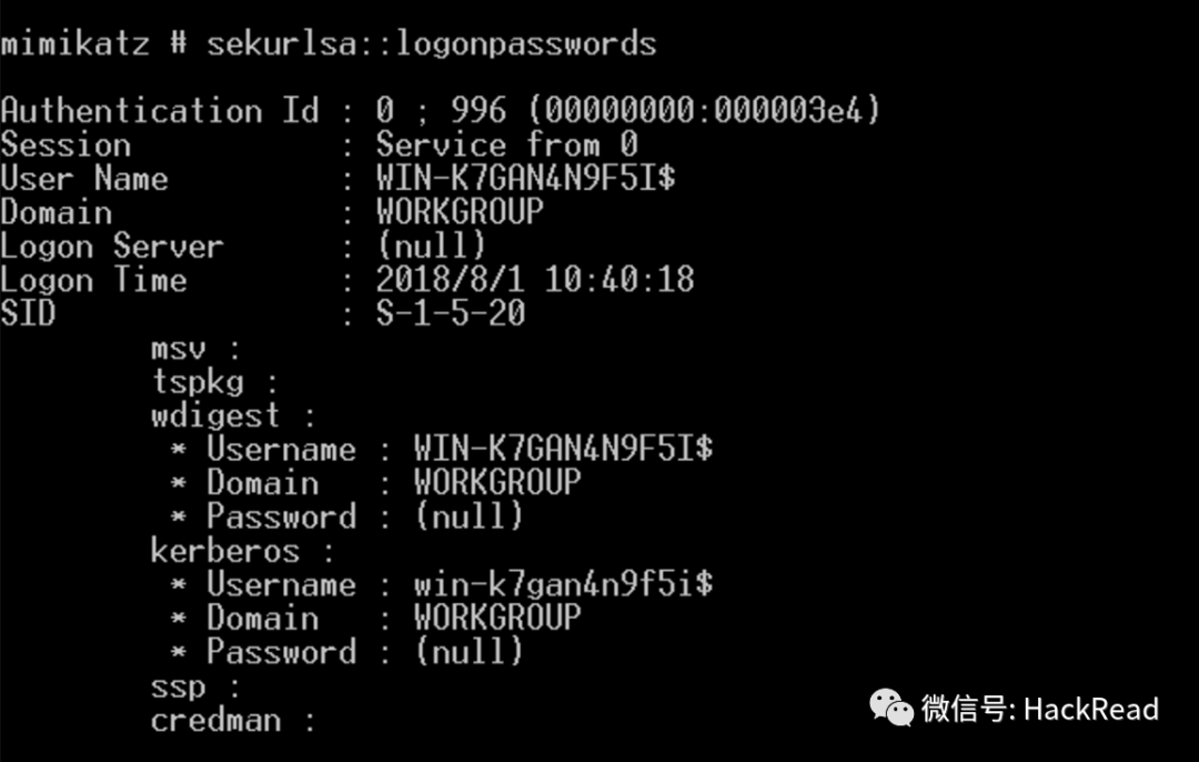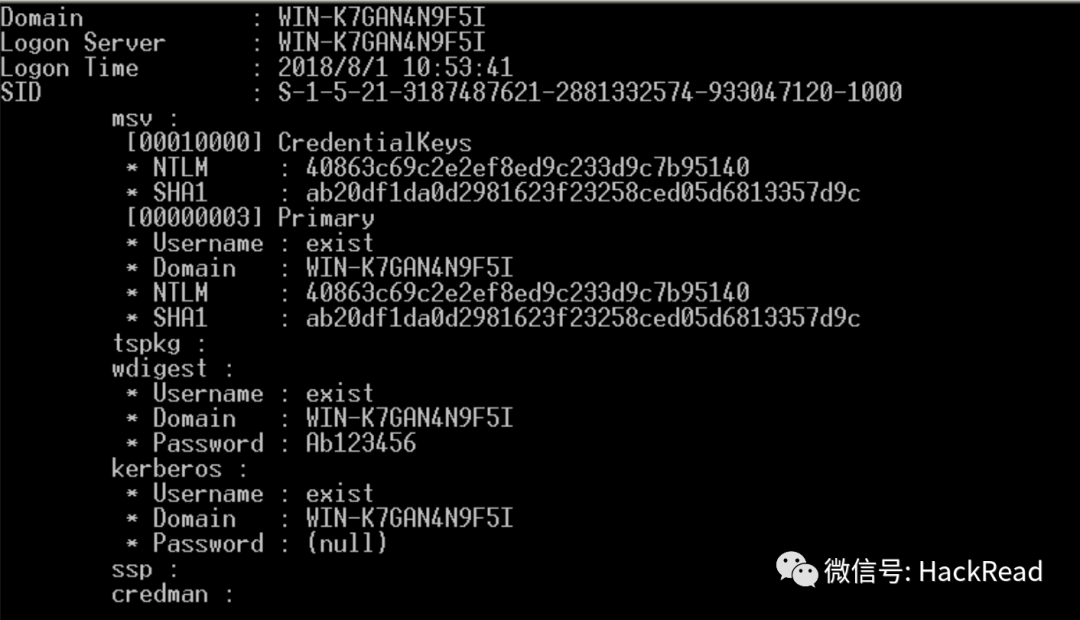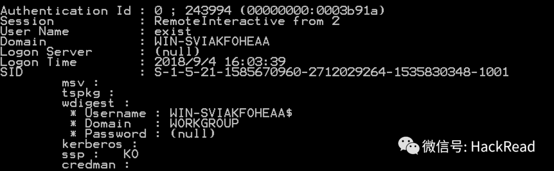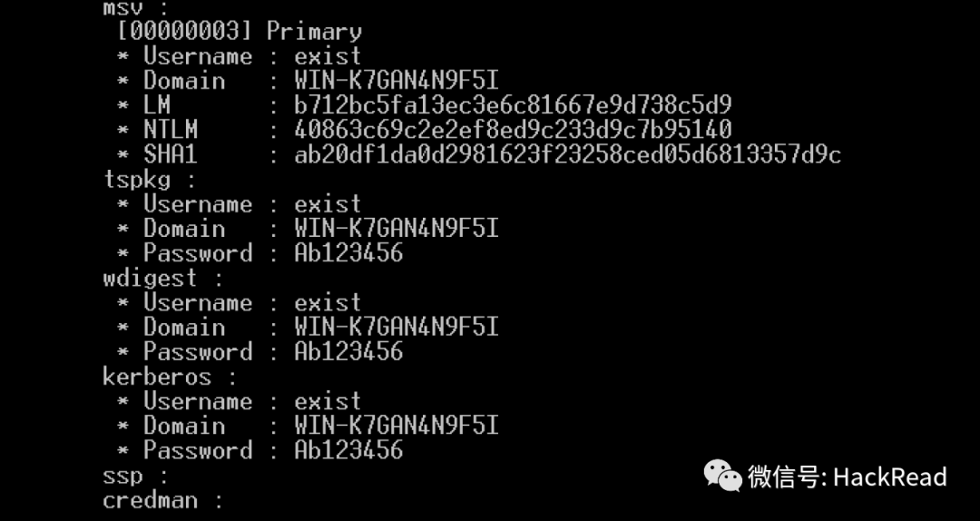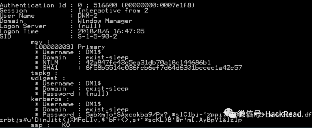 上图中msv、tspkg、wdigest、kerberos这几个ssp都获取到了凭据,它们分别用于Terminal Server认证(RDSH),ntlm认证,摘要认证以及kerberos认证。我们能看到只有msv没有明文密码。从前文中对ntlm认证过程的描述,我们可以发现除了第一步客户端要求用户输入明文密码,之后的认证过程再也没有出现过明文密码。这也就是说,ssp只需要计算ntlm hash并放在内存中就行了。