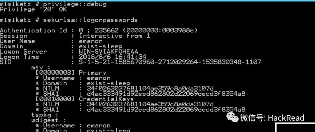 安装kb2871997之后我们使用mimikatz抓取内存中的密码: