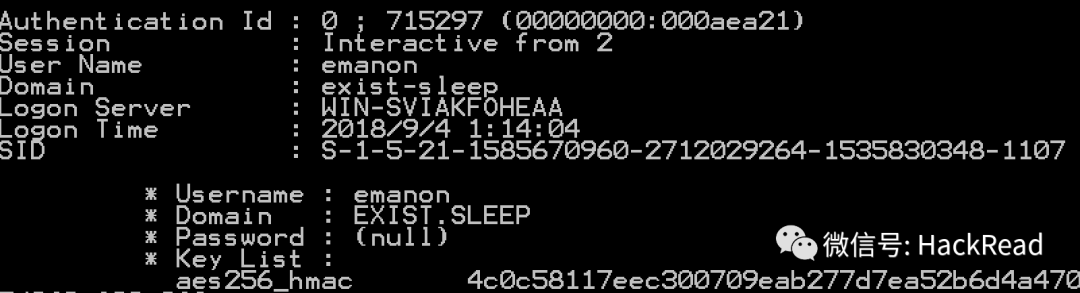 网上有些文章提到了Pass-the-Key(Overpass-the-hash),Protected Users对这种攻击方式也有一定缓解功能。PtK是在域中攻击kerberos认证的一种方式,据称可以在NTLM认证被禁止的情况下用来实现类似PtH的功能(毕竟是针对kerberos认证,其实与NTLM认证没什么关系)。关于这种攻击方式可以查看本节的参考,这里不再赘述。我们比较关心使用mimikatz来Pass-the-Key所需要的信息,其中必须有的是请求tgt所需的用户hash,这可以使用mimikatz中的sekurlsa::ekeys来获取: