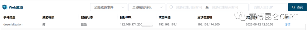 赛博昆仑-洞见平台以风险运营为核心思想,结合资产、漏洞和威胁进行风险量化与风险排序,并在不中断业务运行的前提下完成威胁阻断和漏洞修复,从而实现实时的风险消除。目前赛博昆仑-洞见平台的资产风险检测模块已加入该漏洞的检测规则并提示对应风险:赛博昆仑-洞见平台的Rasp模块检测漏洞利用攻击拦截效果如下:![]()