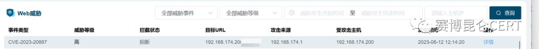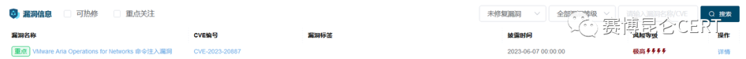 https://www.vmware.com/security/advisories/VMSA-2023-0012.html2023年6月07日,VMware官方发布漏洞通告2023年6月09日,赛博昆仑CERT进行漏洞研究与复现2023年6月12日,赛博昆仑-洞见产品支持CVE-2023-20887、CVE-2023-20888漏洞检测和热补丁防护2023年6月12日,赛博昆仑CERT公众号发布漏洞风险通告![]()