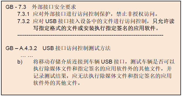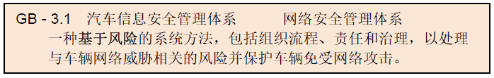 risk),需要实现的只是将风险控制到“可接受”(acceptable)的水平即可。而“可接受”,包括两个含义,一是允许存在漏洞,二是重要的资产得到了适当的保护。也就是说,汽车网络安全应该是“守城”而非“护土”。一个与车辆其他电子系统只共用电源、没有任何有线和无线网络连接的车载移动电视(标准配置),需要满足《汽车整车信息安全技术要求》吗?移动电视上的电信网络端口、USB接口属于国标草案中第7.3.条的“外部接口”吗?从现实的角度给出的答案应该是否定的,而且也不会有什么争议。但从国标《汽车整车信息安全技术要求》中第7.条、第8条、第9条和第10条的规定来看,答案则应该是肯定的。很难想象,按照目前的规定,新国标一旦严格实施会产生什么样的影响,汽车制造商是否能够在经济可行的前提下满足强制性标准的要求,提供合格的产品。最后,再补充一点,个人以为《汽车整车信息安全技术要求》中最重要的也是最基础的要求是“网络安全管理体系”,是里面提到的“风险”。