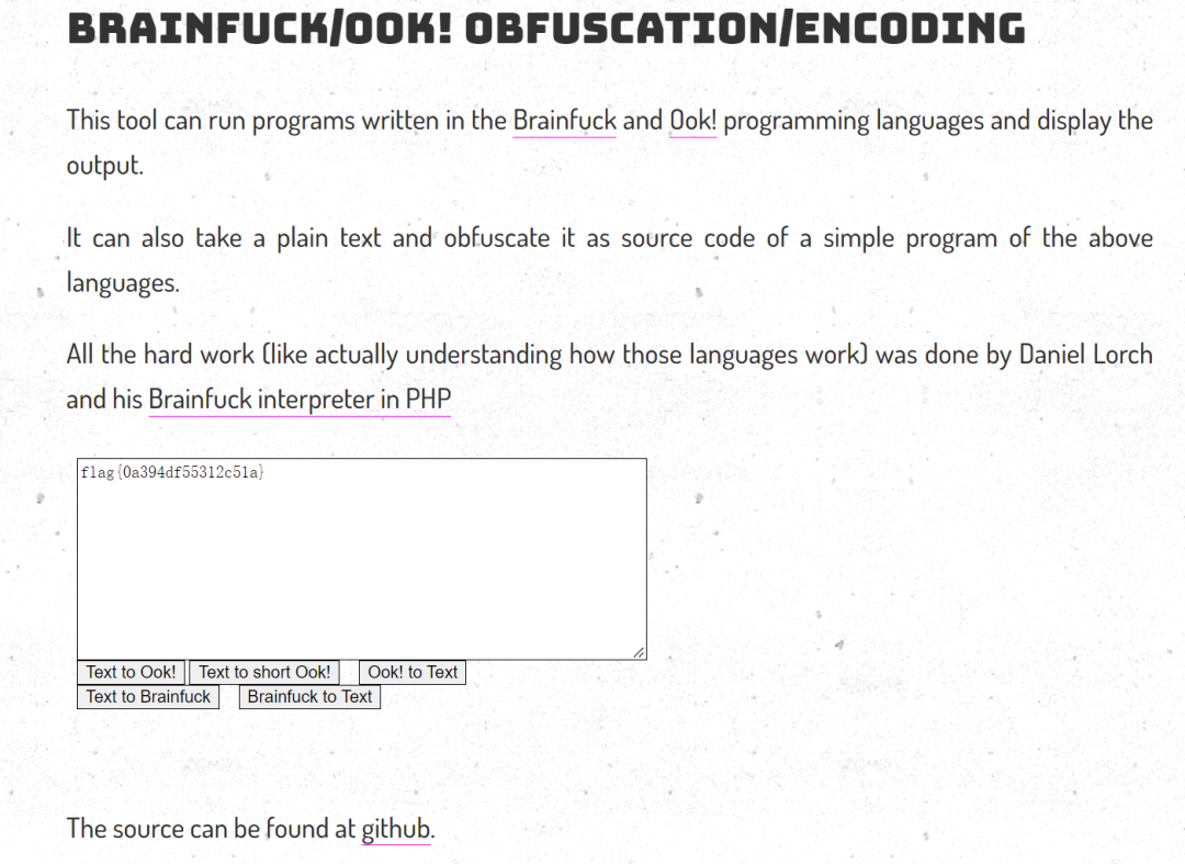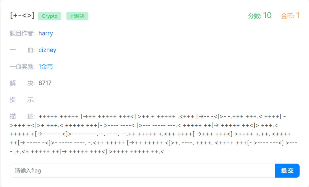 https://ctf.bugku.com/challenges/detail/id/49.html+++++ +++++ [->++ +++++ +++<] >++.+ +++++ .<+++ [->-- -<]>- -.+++ +++.< ++++[ ->+++ +<]>+ +++.< +++++ +++[- >---- ----< ]>--- ----- ---.< +++++ ++[-> +++++ ++<]> +++.< +++++ +[->- ----- <]>-- ----- -.--. ----. --.++ +++++ +.<++ ++++[ ->+++ +++<] >++++ +.++. <++++ ++[-> ----- -<]>- ----- ----. -.<++ +++++ [->++ +++++ <]>+. ----. ++++. <++++ +++[- >---- ---<] >---- .+.<+ +++++ ++[-> +++++ +++<] >++++ +++++ ++.<Brainfuck解码