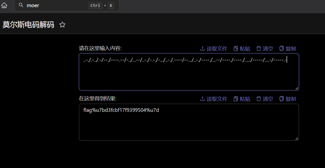 flag%u7bd3fcbf17f9399504%u7dstr = '%u7b'unicode_hex = str[2:] # 提取十六进制数字部分(从索引2开始)unicode_char = chr(int(unicode_hex, 16)) # 将十六进制数字转换成Unicode字符print(unicode_char) # 输出结果为 '{'