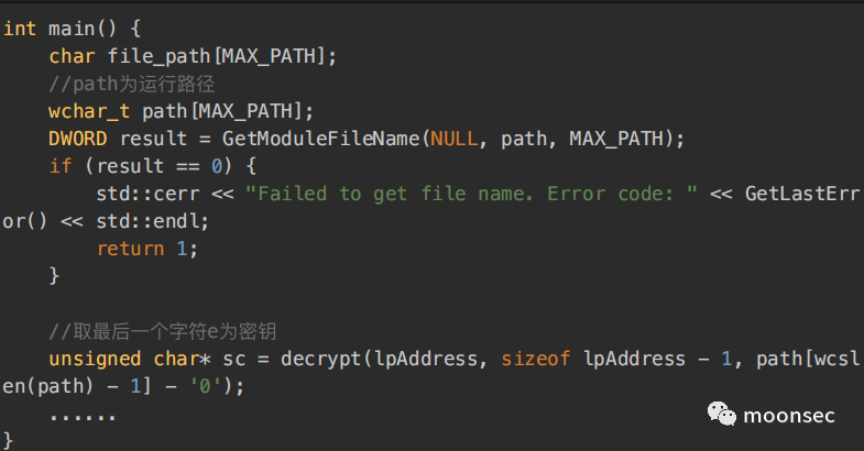 系统⽬录下的某个⽂件名或注册表中某个固定的值相关等,当然,考虑到注册表操作可能会被360这些杀 软拦截,所以我设成了运⾏路径的最后⼀个字符,如果我的免杀⻢newsc.exe运⾏路径为C:\Users\Administrator\Desktop\newsc.exe,那么最后⼀个字符“e”就为解密密钥。代码实现如下: