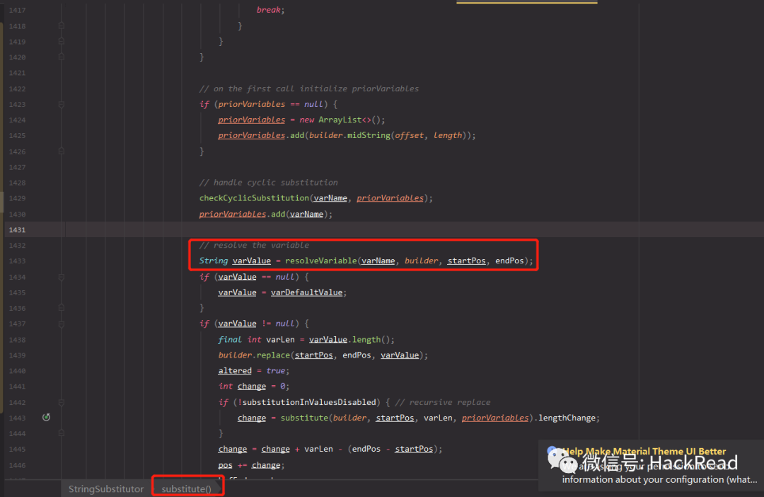 并在构造方法中调用了this.setVariableResolver(variableResolver)设置VariableResolver为InterpolatorStringLookup类,之后继续跟入InterpolatorStringLookup的lookup方法中。