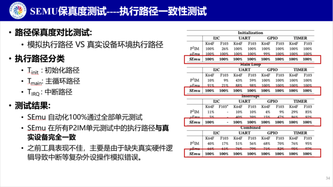 在保真度方面,SEmu自动化100%通过全部单元测试,SEmu在所有P2IM单元测试中的执行路径与真实设备完全一致。