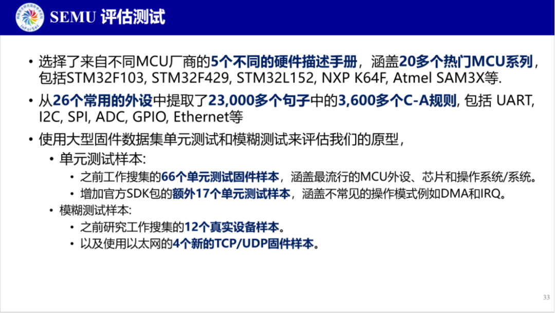 周老师选择了来自不同MCU厂商的5个不同的硬件描述手册,涵盖20多个热门MCU系列,从26个常用的外设中提取了23,000多个句子中的3,600多个C-A规则,使用大型固件数据集单元测试和模糊测试对SEMU进行了评估测试。