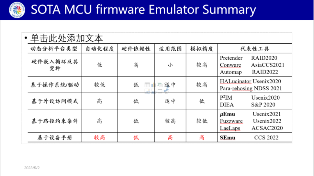 在介绍完自己的研究内容后,周老师对目前最前沿的MCU固件模拟研究进行了总结,并提出了对未来研究的一些讨论和展望。