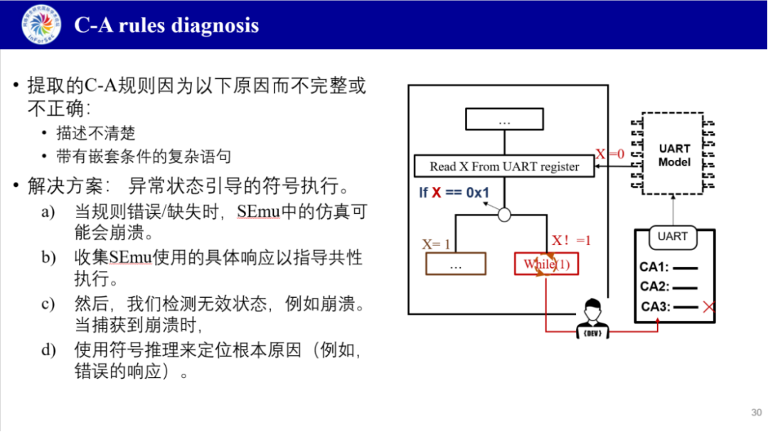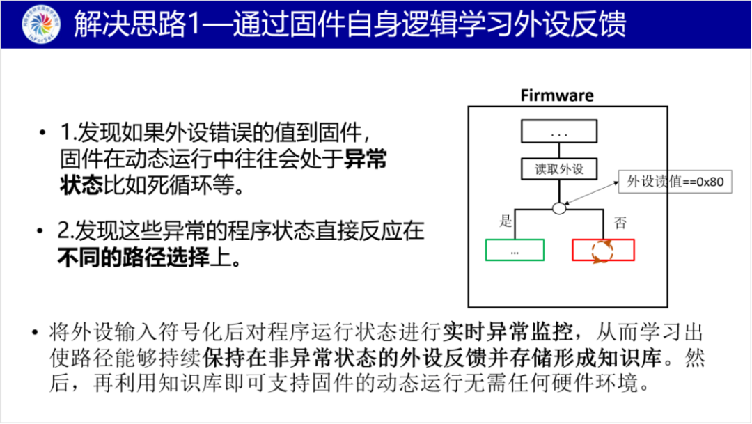 为了实现该目标,周老师提出了通过固件自身逻辑学习外设反馈的解决思路。该方案的关键在于周老师发现如果外设错误的值到固件,固件在动态运行中往往会处于异常状态比如死循环等,并且这些异常的程序状态直接反应在不同的路径选择上。其核心思路在于将外设输入符号化后对程序运行状态进行实时异常监控,从而学习出使路径能够持续保持在非异常状态的外设反馈并存储形成知识库。然后,再利用知识库即可支持固件的动态运行无需任何硬件环境。