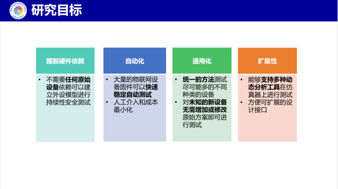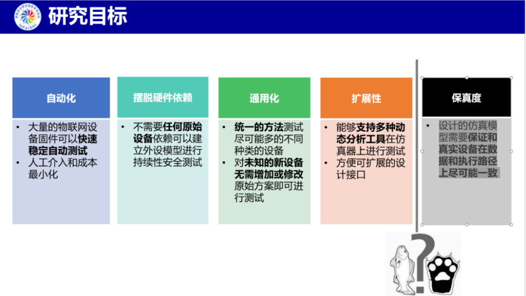 基于这些调研结果,周老师提出了他们的研究目标,即摆脱硬件依赖,提供自动化程度,测试方法通用化以及足够的扩展性。