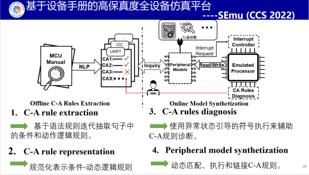具体而言,周老师基于自然语言处理技术实现了基于设备手册的高保真度全设备仿真平台SEmu,该研究成果发表于ACM CCS 2022上。