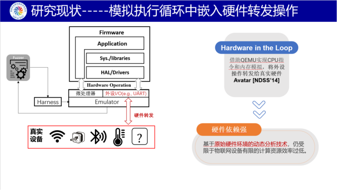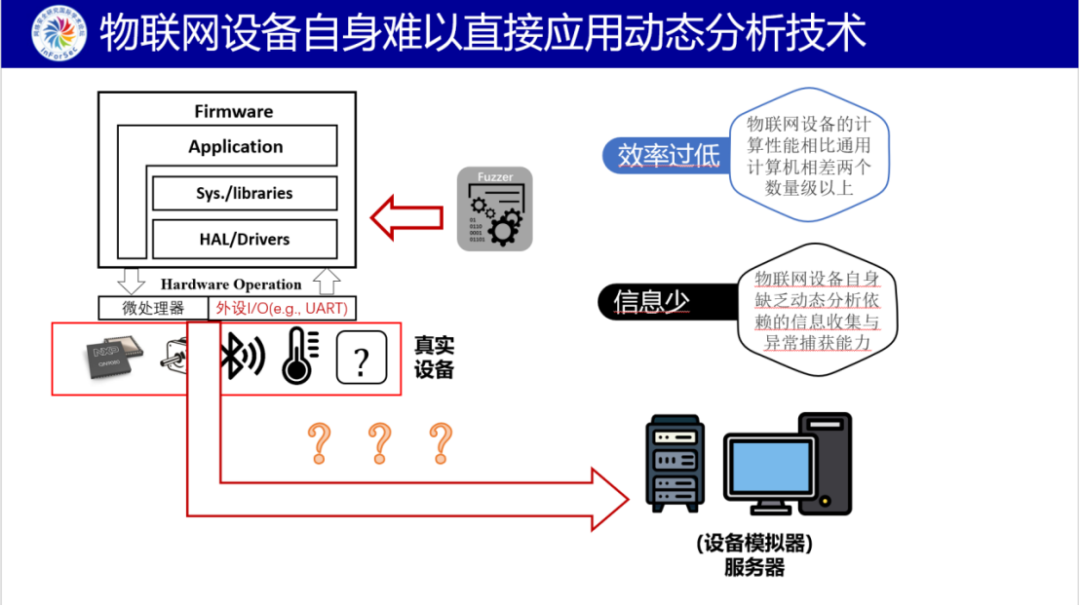周老师指出,物联网设备自身难以直接应用动态分析技术,主要是计算效率过低以及信息收集能力较弱导致的。于是周老师开始考虑是否能够通过在服务器上对物联网设备进行模拟来解决上述问题。