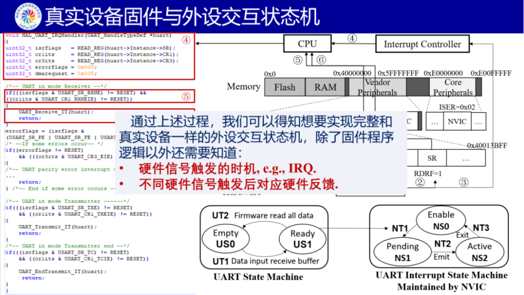 经过进一步地分析,周老师发现想要实现完整和真实设备一样的外设交互状态机,除了固件程序逻辑以外还需要知道:硬件信号触发的时机,如IRQ,以及不同硬件信号触发后对应硬件反馈。