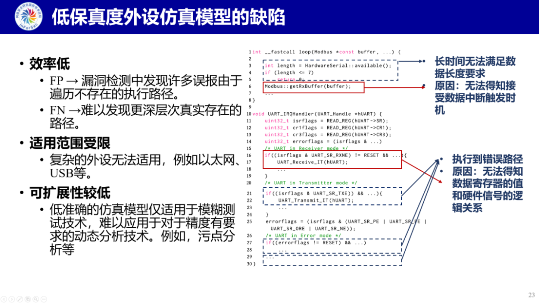 周老师指出现有的外设仿真模型保真度低,存在效率低,适用范围受限,可扩展性较低的缺陷,这些问题的根本原因在于主要的关于外设行为的硬件知识缺失。
