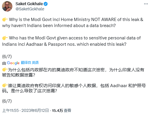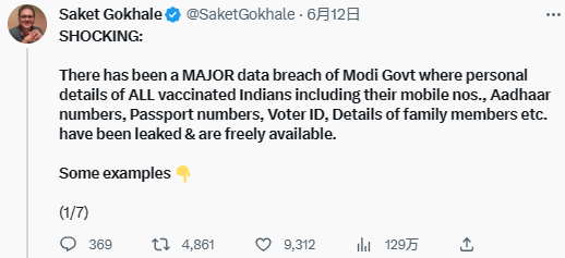 在这个泄露的数据库中,能够轻易地免费获取几乎所有接种了 Covid-19 疫苗的印度公民的个人详细信息,连印度政治领袖也未能幸免。崔纳木国大党领导人Saket Gokhale对此泄露事件发推谴责莫迪政府的数据保护不力以及无作为。