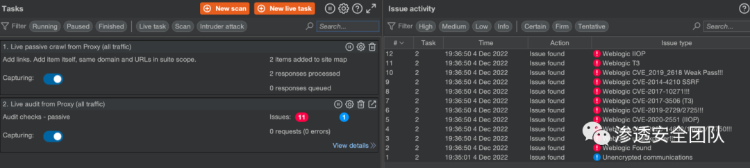 注意⚠️:扫描结束后才会在BurpSuite的Target、Dashboard模块显示高危漏洞,进程扫描中无法进行同步,但可以在插件中查看(涉及到DoPassive方法问题)。