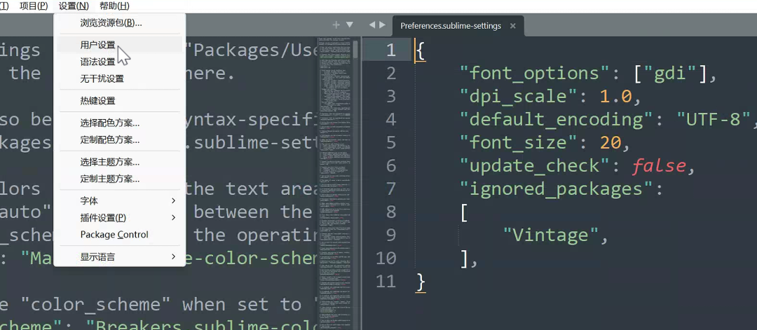 点preferences-setthings(用户设置),添加以下代码,记得检查格式,然后保存文件