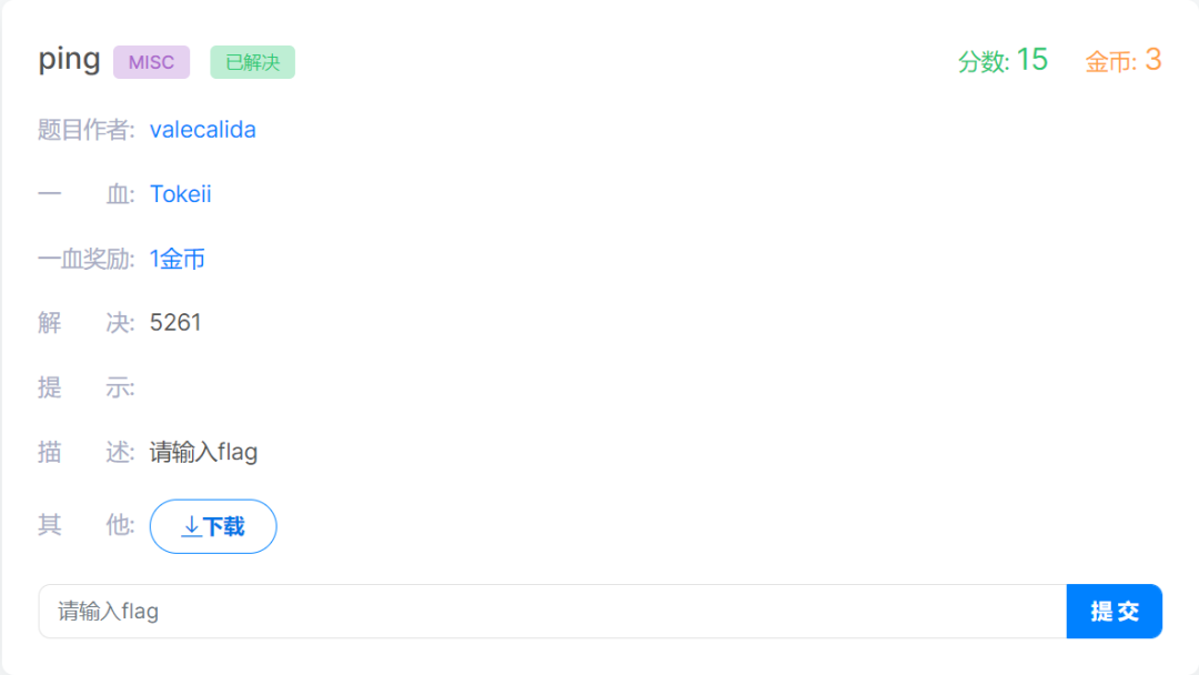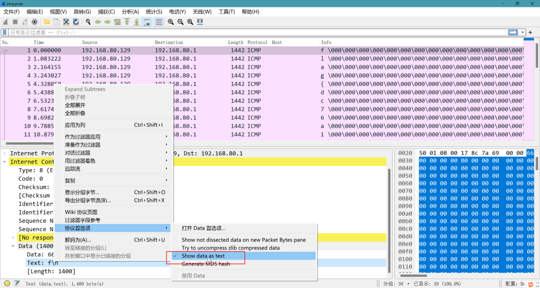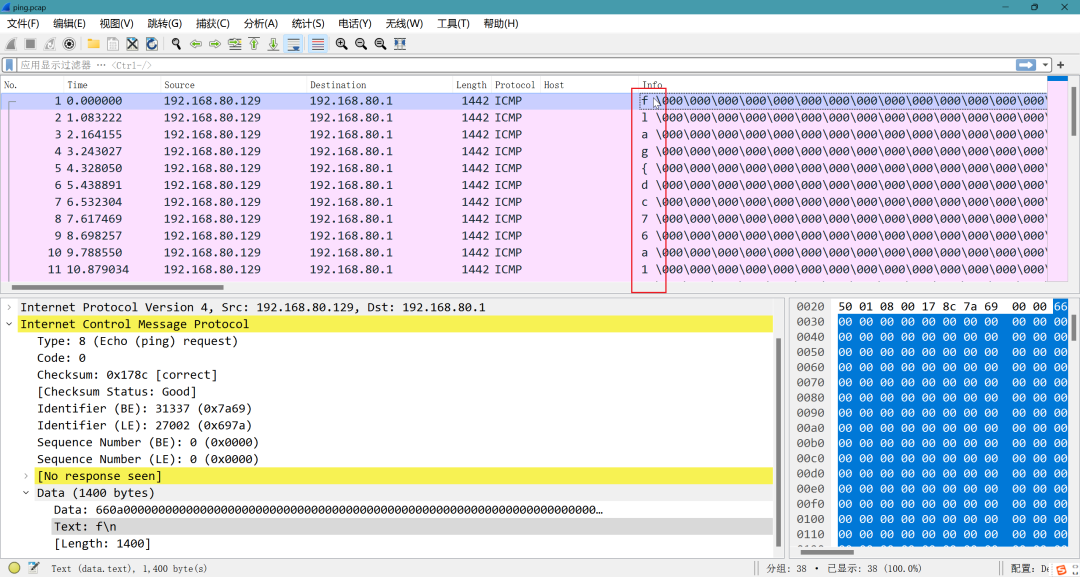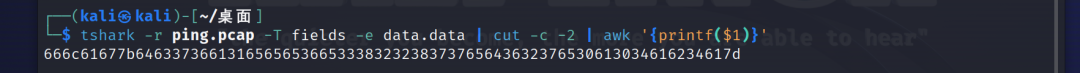 tshark -r ping.pcap -T fields -e data.data | cut -c -2 | awk '{printf($1)}'┌──(kali㉿kali)-[~/桌面]└─$ tshark -r ping.pcap -T fields -e data.data | cut -c -2 | awk '{printf($1)}'666c61677b64633736613165656536653338323238373765643632376530613034616234617d
