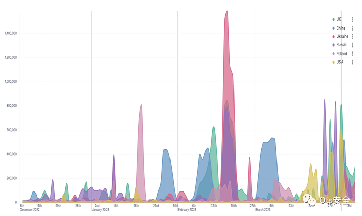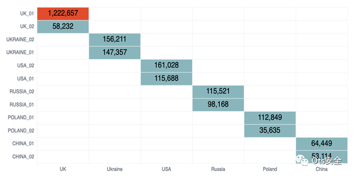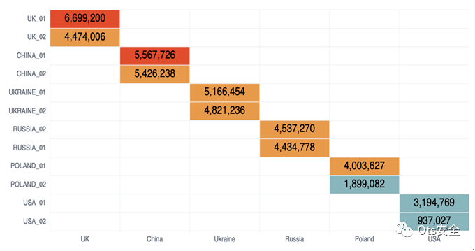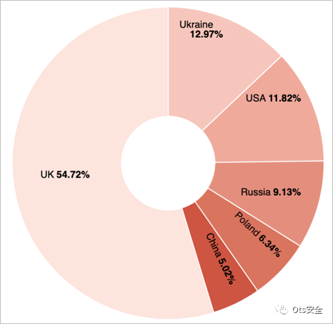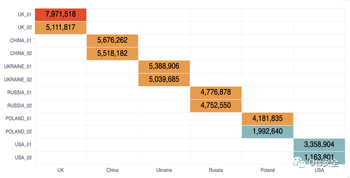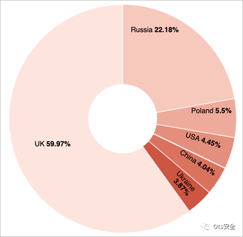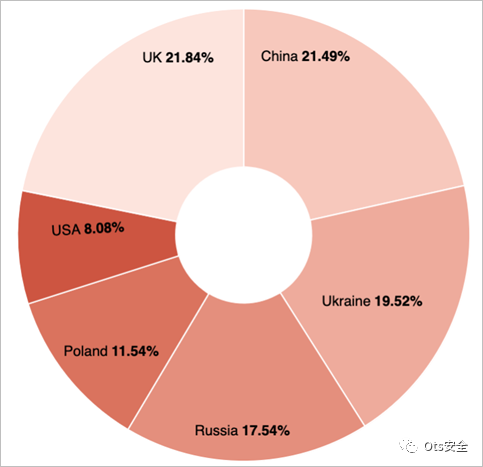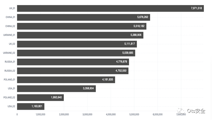 最有针对性的国家如下所示(图 11)。双传感器证实了这一点——僵尸网络针对特定国家或世界区域的 IP 范围,而不是整个 IP 范围。毫无疑问,英国和中国是许多行业和公司的全球通信“枢纽”的一部分——或许我们可以在这里为如此激烈的攻击寻找一些理由。另一方面,乌克兰和俄罗斯的传感器也经历了非常艰难的时期,得分相似。