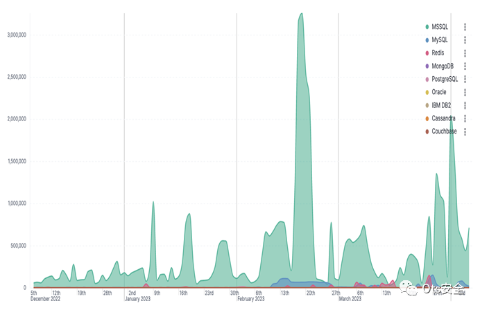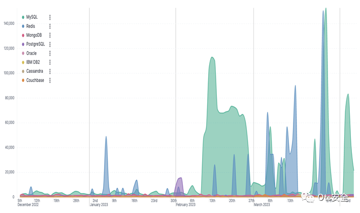 一个有趣的发现是,某些数据库比其他数据库更频繁地遭受凭据暴力攻击。在这些暴力攻击中,僵尸网络反复尝试不同的用户名和密码组合以获得未经授权的访问,在某些特定数据库中表现出更高的流行率。