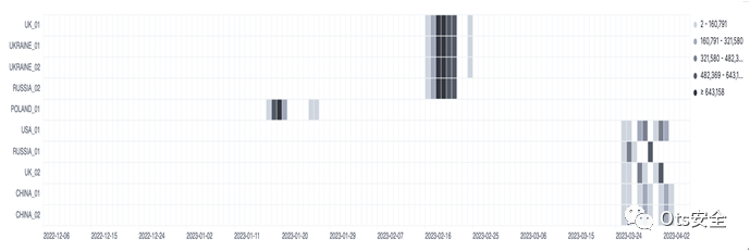 该 IP 组的运营区域有限且非常有选择性。毫无疑问,将这组地址与其他地址区分开来的一个有趣事实是,我们只观察过几次,再也没有观察过!这些地址背后的组织似乎有选择地、谨慎地使用它们。与此同时,其他IP地址也在持续运行,强度随机,但始终“在附近”。