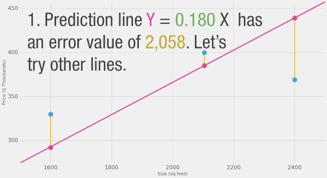 我们能否在估计价格方面做得比基于数据点平均值更好呢?让我们试试。首先,让我们定义在这种情况下更好的意义。如果我们将模型应用于我们拥有的三个数据点,它会做得多好?