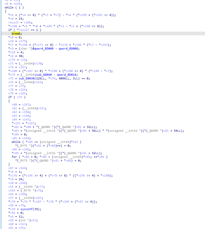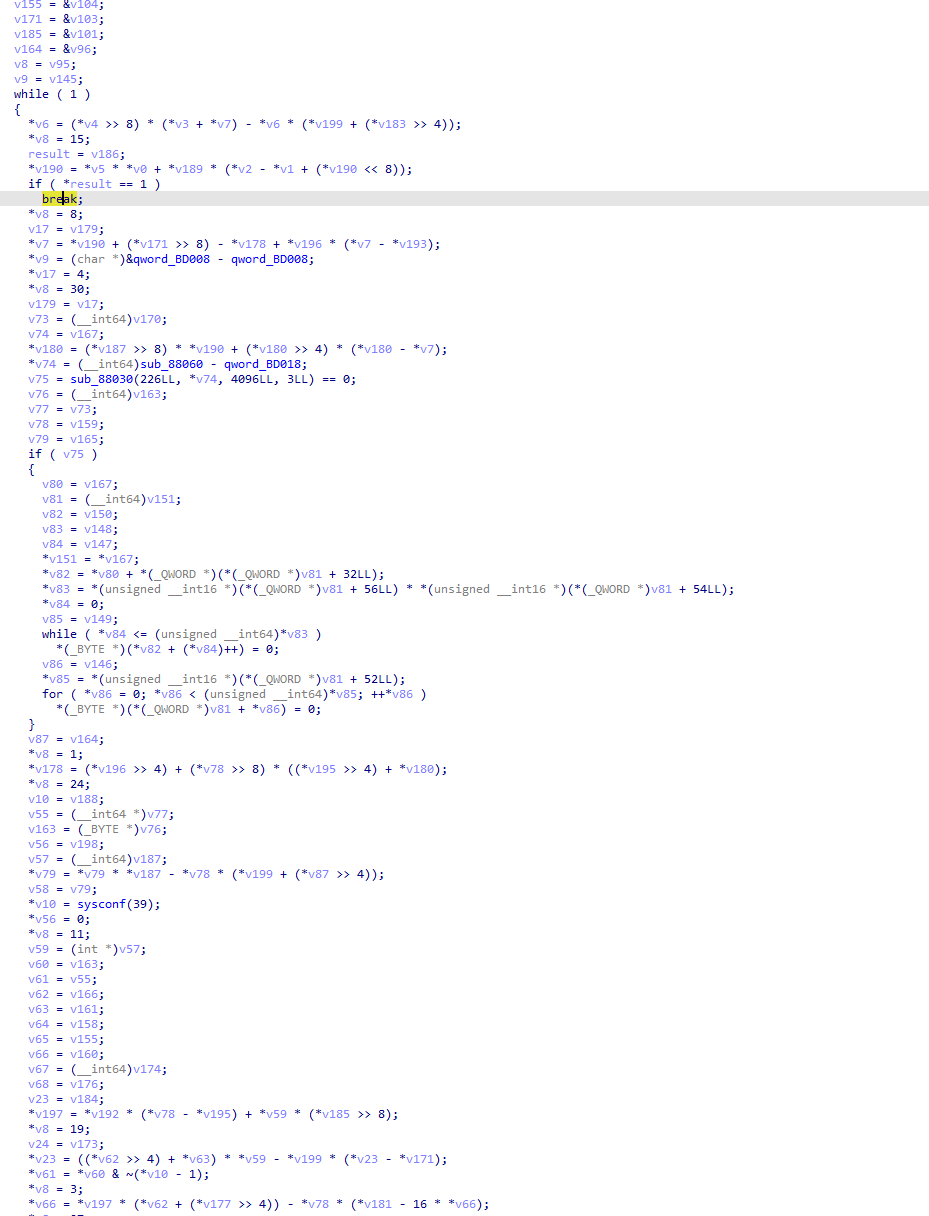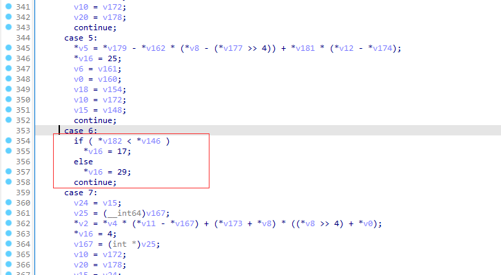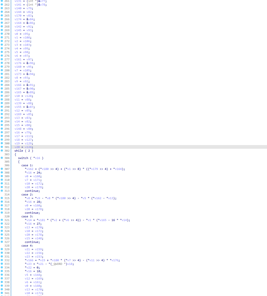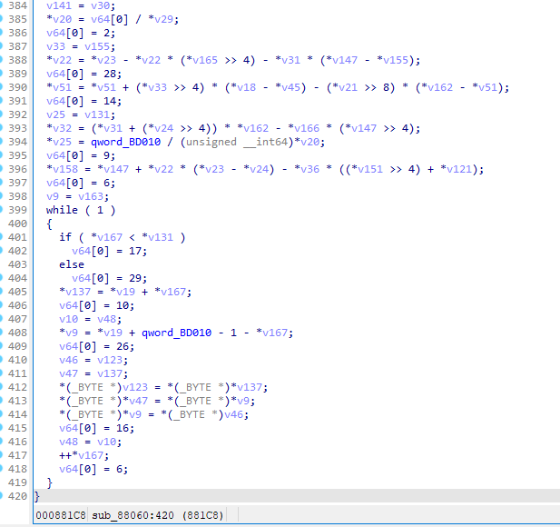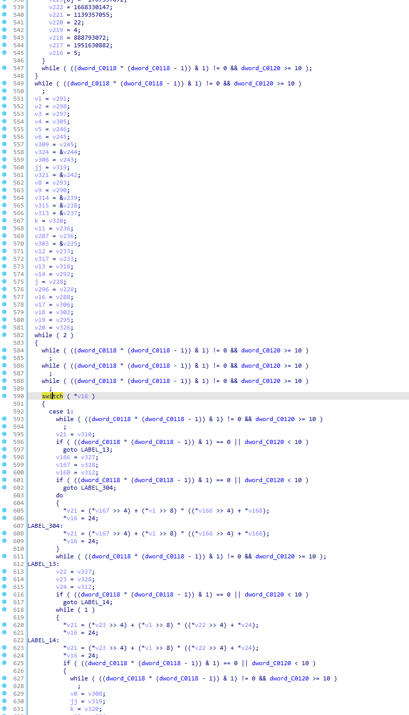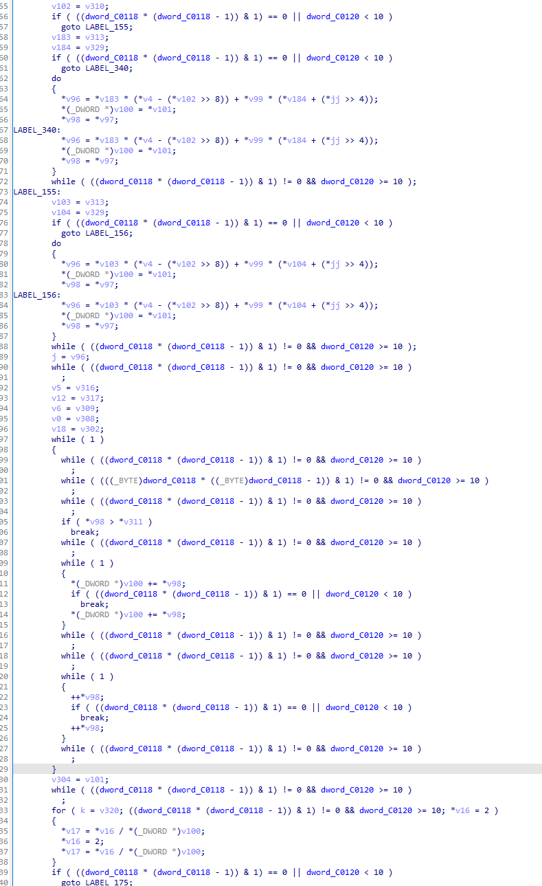 ida查看函数的伪代码,包含大量的 ((dword_C0118 * (dword_C0118 - 1)) & 1) == 0 || dword_C0120 < 10判断。