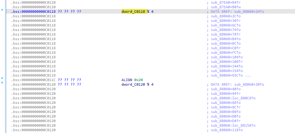 通过查看代码可知,bcf所引用的地址为dword_C0118 和 dword_C0118 ,这两个地址都属于.bss段。