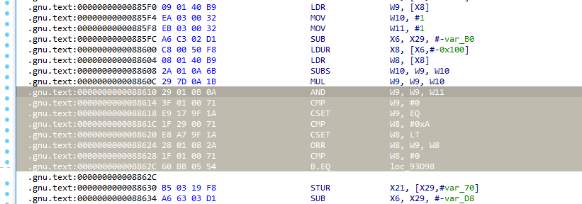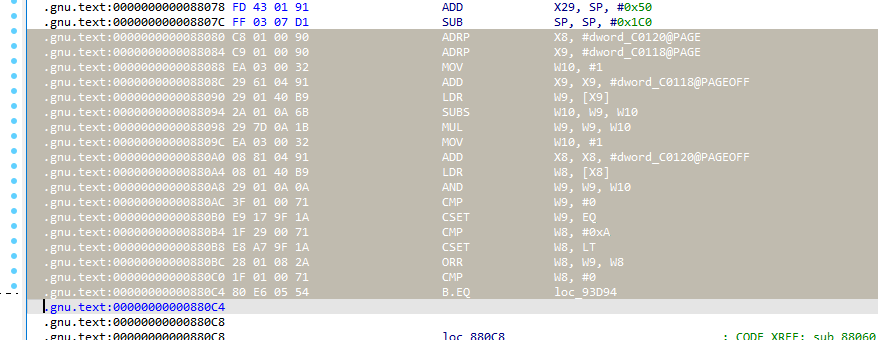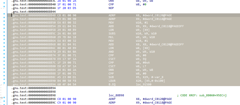 通过分析可知,最后的B.EQ 永远不会跳转,所以把该指令 nop 即可。