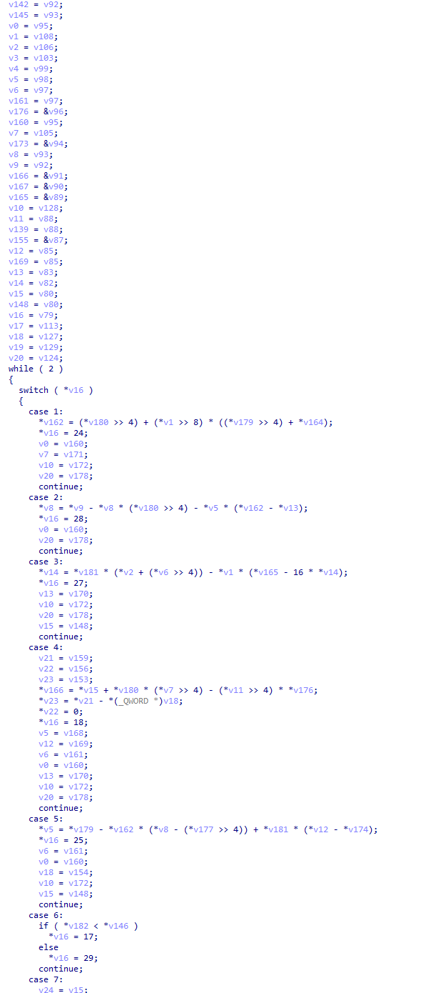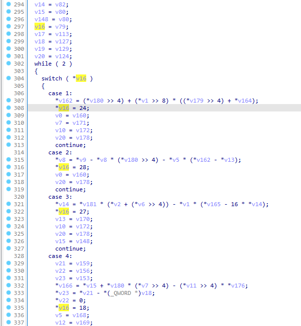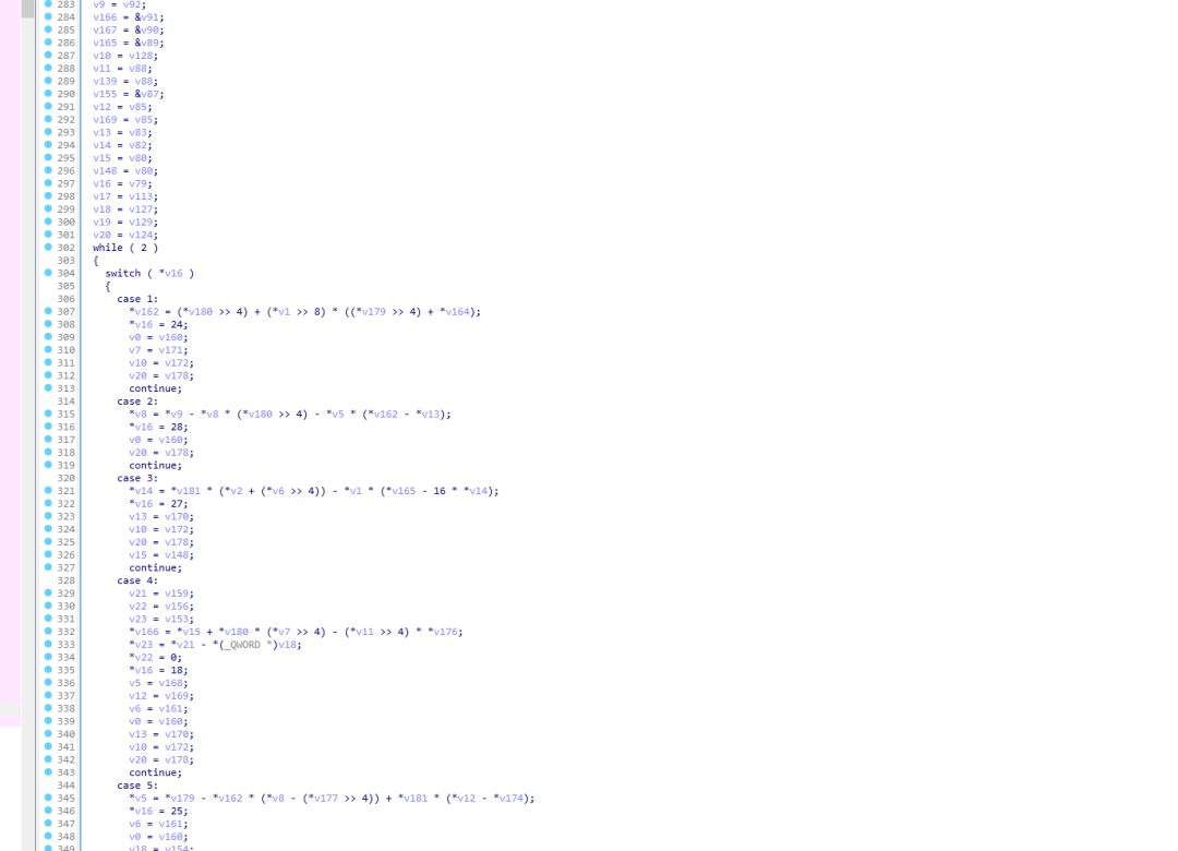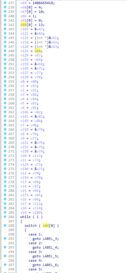 查看上文处理后的伪代码,包含while和switch组合,将原本连续的代码分割成了多块,我们的目标是去除该结构,将所有代码连接起来。