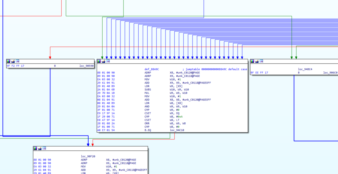 通过查看流程图可知,所有分支执行完后都会跳转到def_88A9C(0x90ED8)再次进行分发。