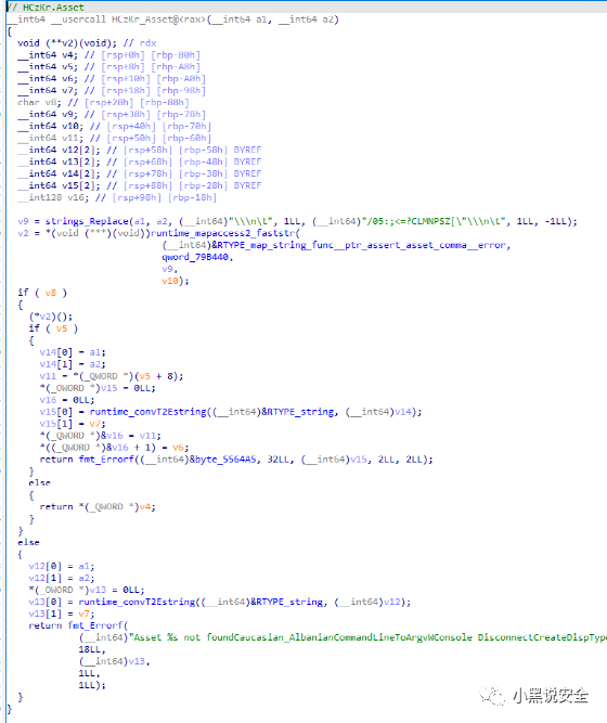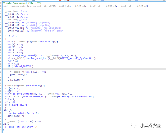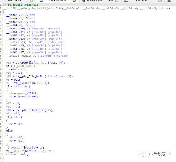 {v9 = runtime_concatstring2(0LL, (__int64)&byte_54F873, 6LL, a5, a6); --字符串拼接v6 = HCzKr_Asset(v9, v10);io_ioutil_WriteFile(a3, a4, v6, v7, v8, 493);main_Open_normal_file_pLTZN(a1, a2, a3, a4, 0LL, 0LL);}