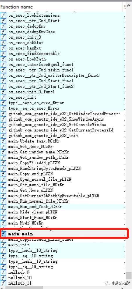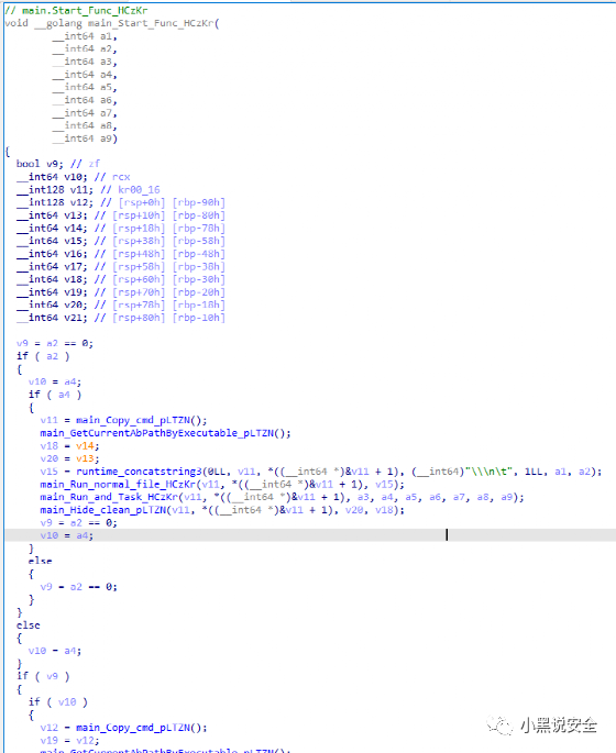 void __cdecl main_main(){main_Hvdf_HCzKr();main_Start_Func_HCzKr((__int64)&byte_55859B, 40LL, (__int64)&byte_54F93F, 6LL, 0LL, 0LL, 30LL, 60LL, 10LL);从第一个main_Hvdf_Hczkr() 开始void main_Hvdf_HCzKr(){main_ShowConsoleAsync(0LL);}ShowConsoleAsync是golang里面隐藏/显示windows系统下的黑色命令窗口