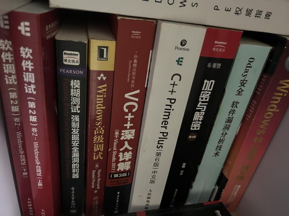之后就买了很多书看,听一位师傅说缺二进制方向,于是就开始学C/C++,汇编 PE,windows编程 MFC等,后面买的0day安全,在课上用了很长时间偷偷看完,最后看完了泉哥的漏洞战争,就到了假期...