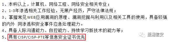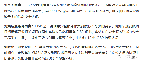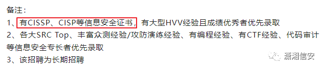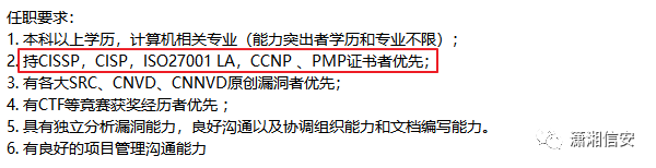 最近几年看到很多安全岗位的招聘信息中都注明拥有CISP、CISP-PTE、CISSP、ISO27001等安全证书的求职者会被优先考虑,这算是一个加分项吧。