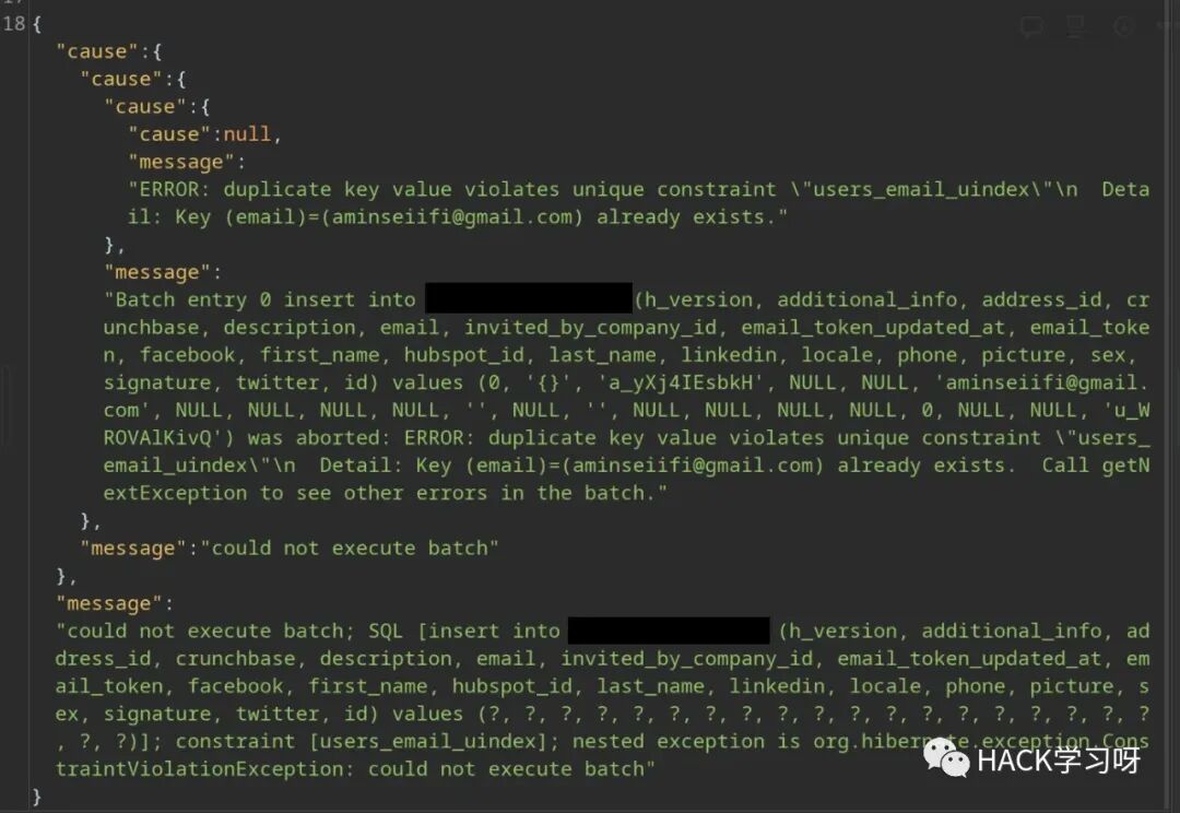接下来,在以我以前的用户身份登录时,我编辑了我的个人资料,并将公司 ID 替换为我之前创建的公司的 ID。令我惊讶的是,我收到了一个包含 SQL 查询错误的响应 API。我注意到在尝试使用重复的电子邮件创建另一个帐户时会触发类似的 API。