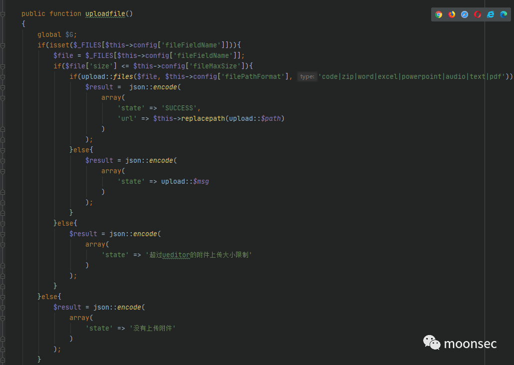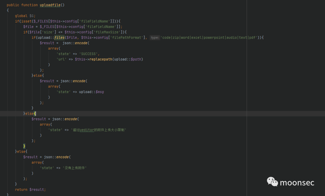 而在uploadfile()方法中就一目了然了,该处调用files()方法并且可以上传code类型下的后缀文件,而