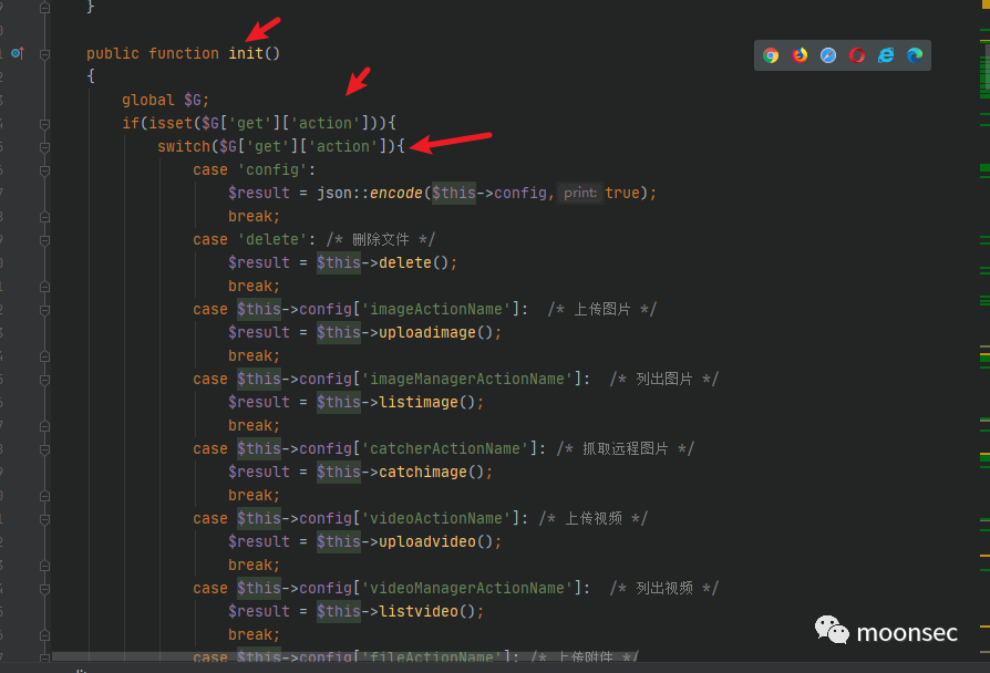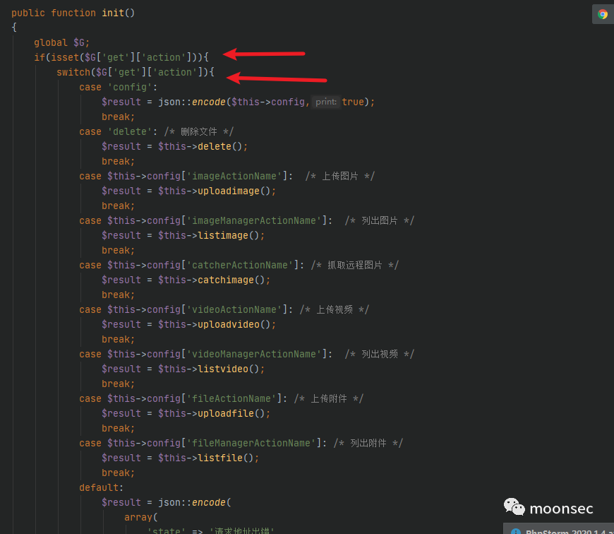 进行路由选择,也就是我们上面分析的路由。通过路由找到功能点文件ueditor.php下ueditor类下的init()方法,上面的路由中传入了