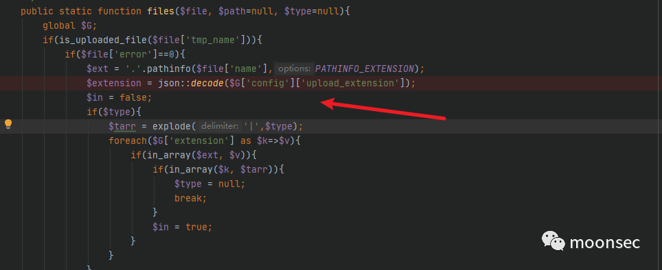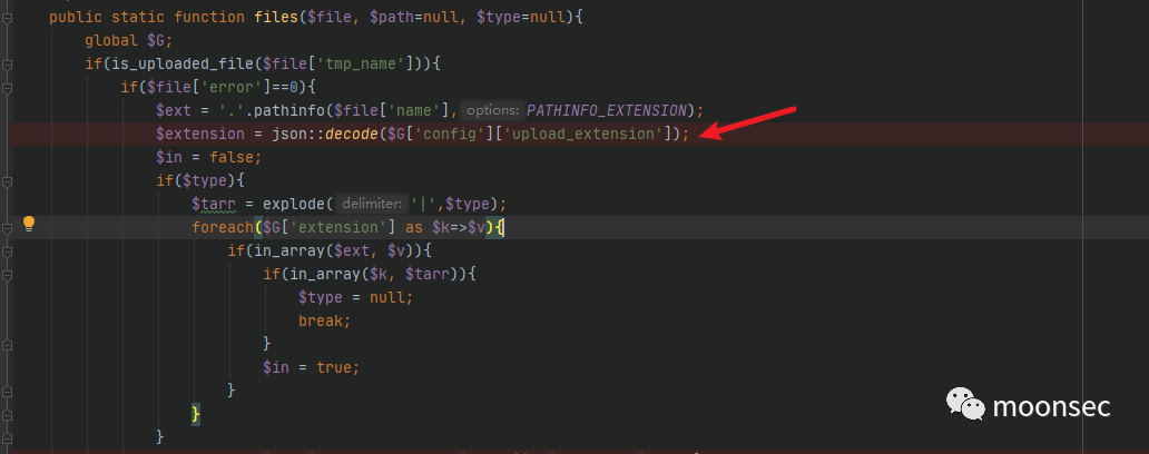 ($type=true && !$in=true) , !$type=true 那么$type的值为NULL即可。我们全局搜索extension中定义的类型,发现extension.json文件中定义了我们上传的类型