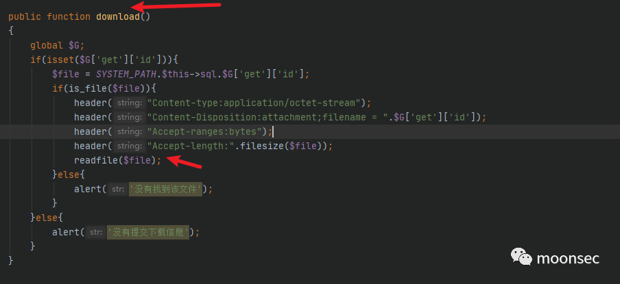 通过上面的路由分析我们不难找到这里的 download() 方法,这里通过66行GET传入 id 参数,在67行将传入的id参数拼接到路径中,这里的sql为上面定义的路径,最后在代码73行处使用readfile()函数进行文件读取。可以看出这里id参数没有进行任何过滤就进行了拼接,所以造成任意文件下载。