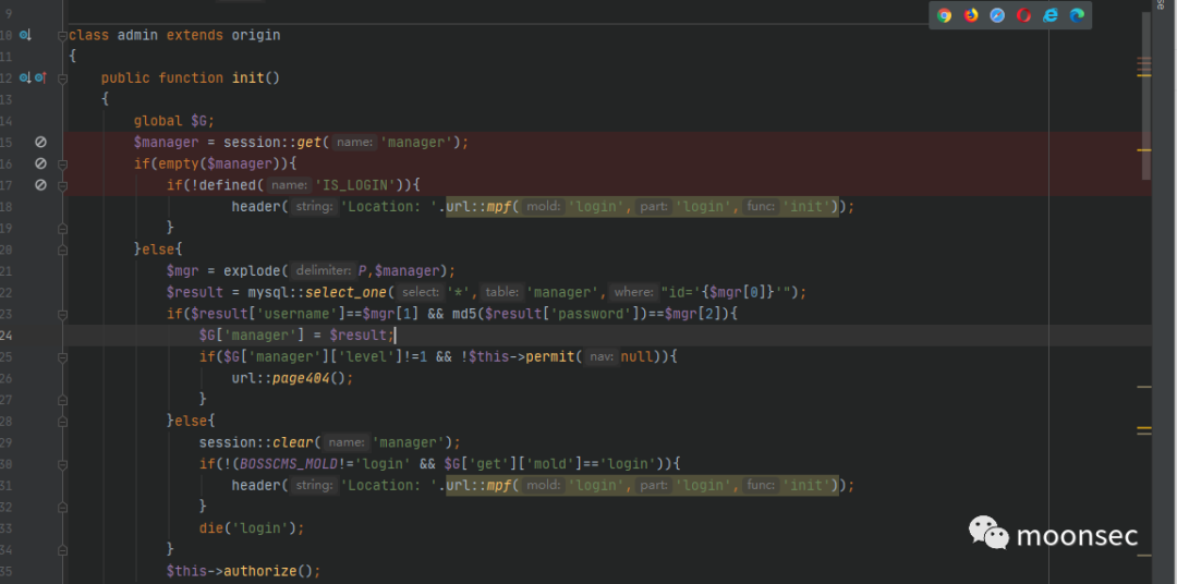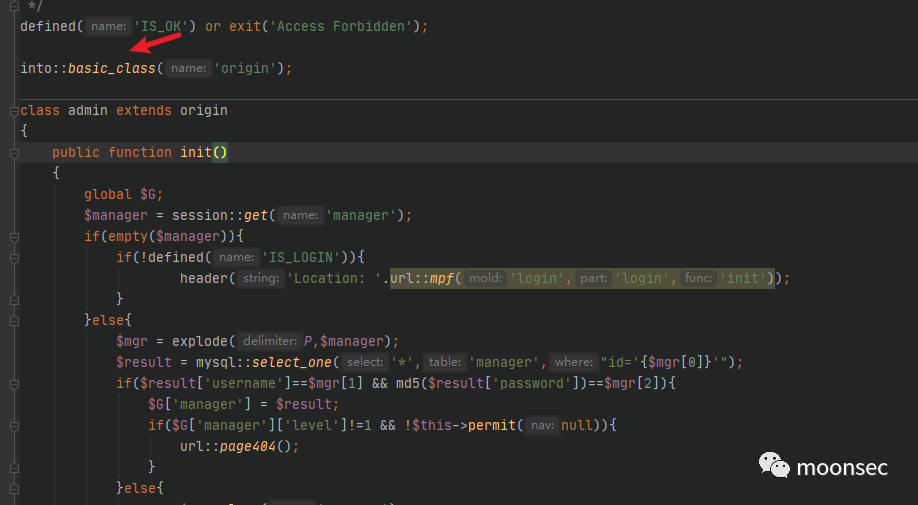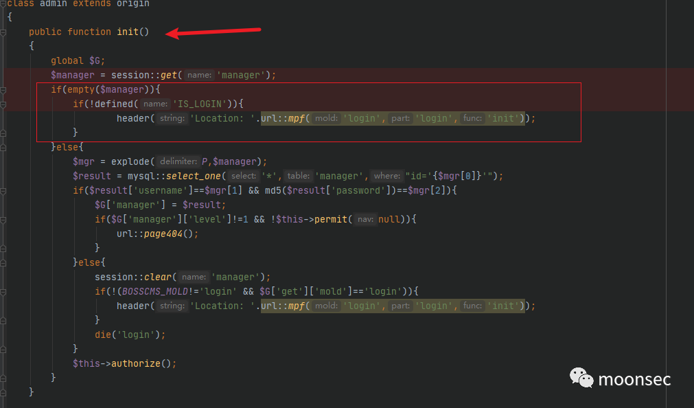 load_class() 加载类文件,然后加载admin类文件下的 init() 方法。在调用admin类下的 init() 方法中通过session类下的 get() 方法获取登录后的session,如果读取不到session的话get()方法则返回false,那么这里就会进入到16行的if条件,在17行判断是否定义IS_LOGIN 常量,如果未定义则通过header()进行跳转,在跳转后代码仍然会继续向下执行而没有使用die()函数结束下面语句的执行。