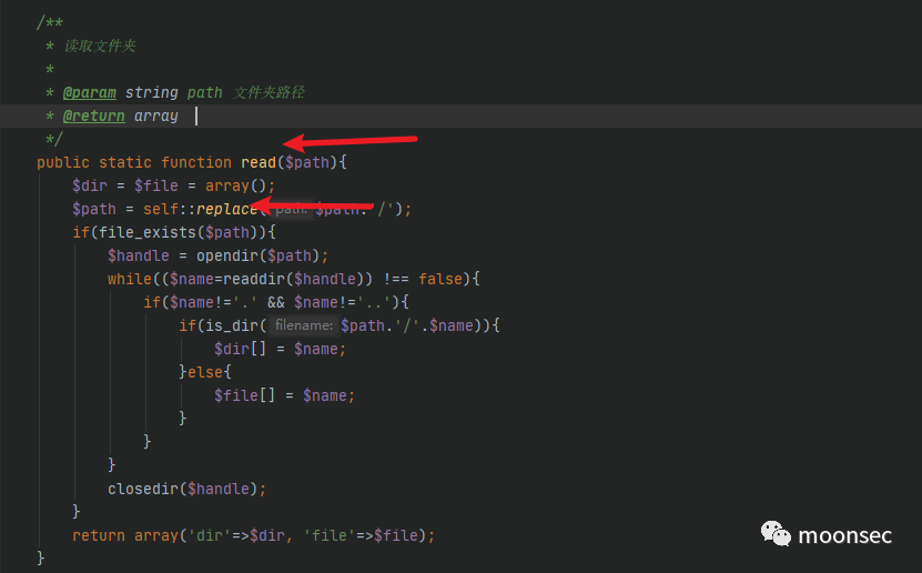 在read()方法中我们可以看到代码129-130行通过opendir()、readdir()打开目录并读取目录中的内容,